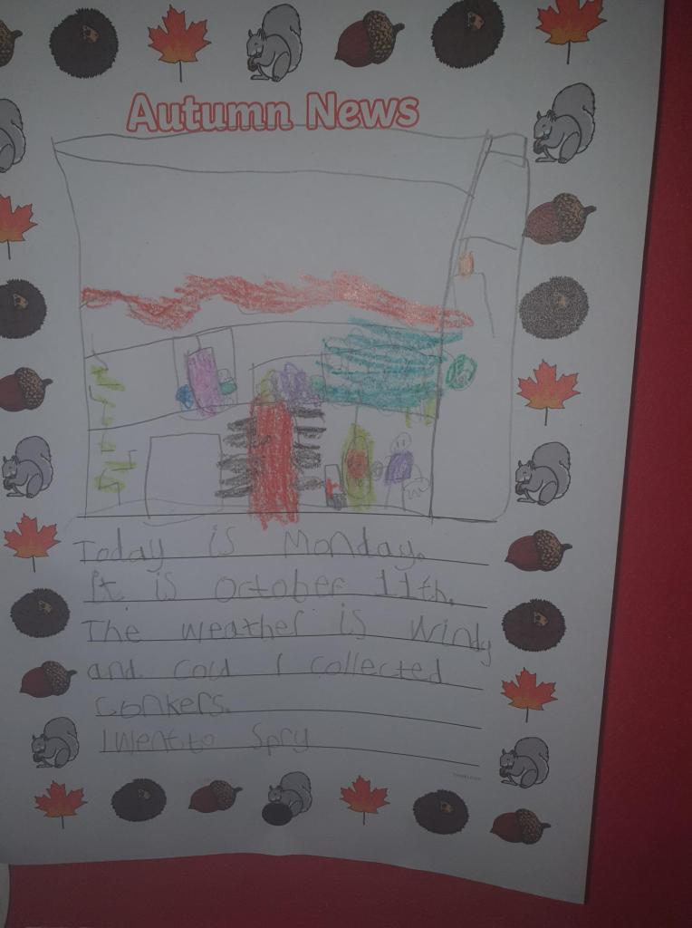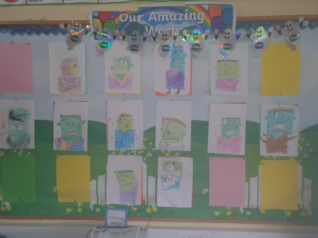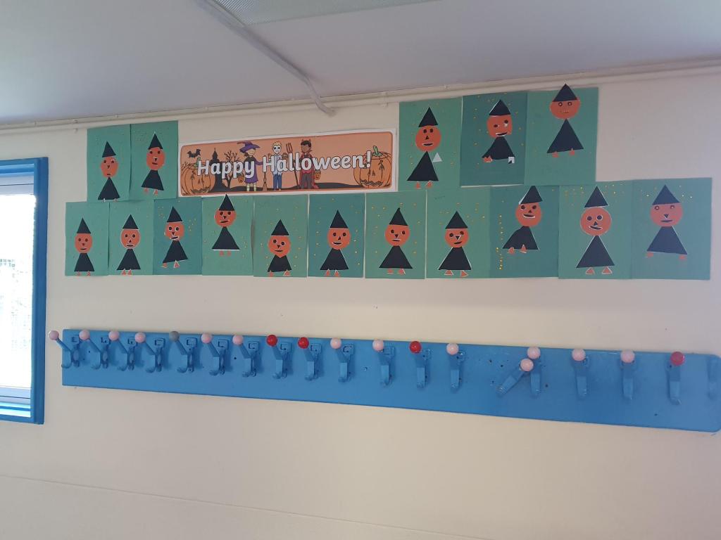 1st Class Room 12 have been very busy learning and writing about the season of Autumn this month. We have also been preparing for Halloween. Look at some of our Artwork. We used our 2-D shapes to make witches and the monster Frankenstein. You can read some of our Autumn News too!