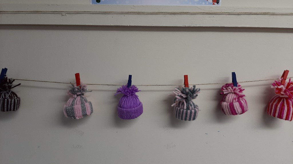 It’s winter! That means time to wear our hats and scarves again. The girls had a great time creating these mini hats with wool.